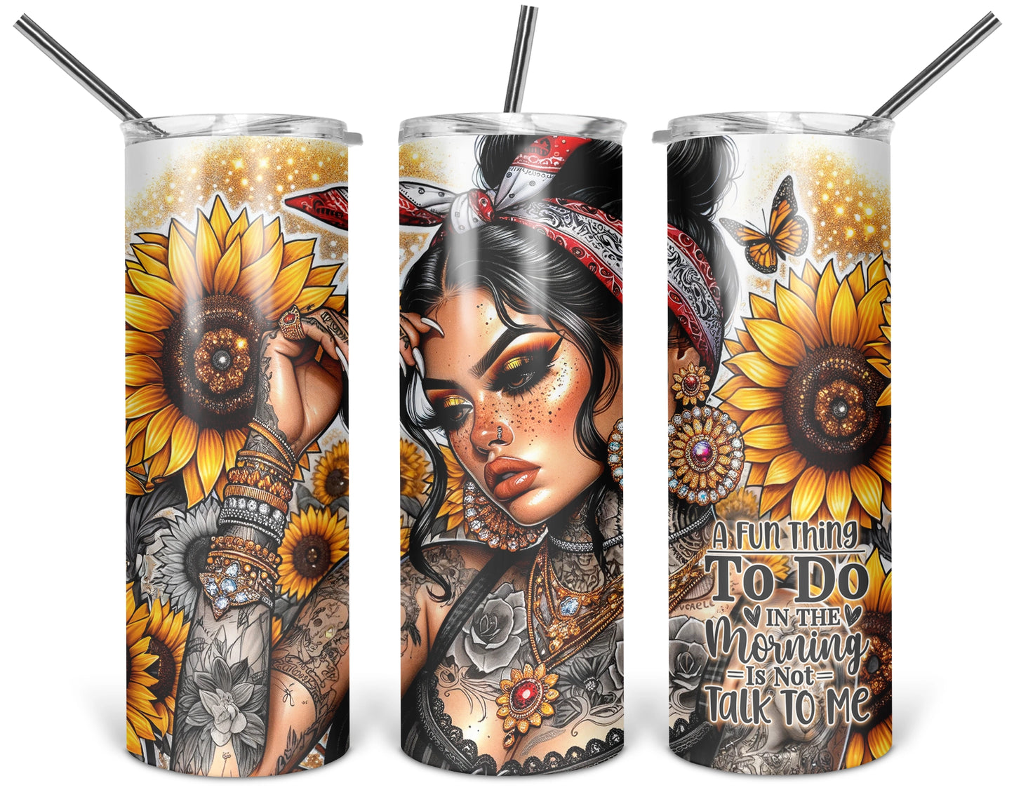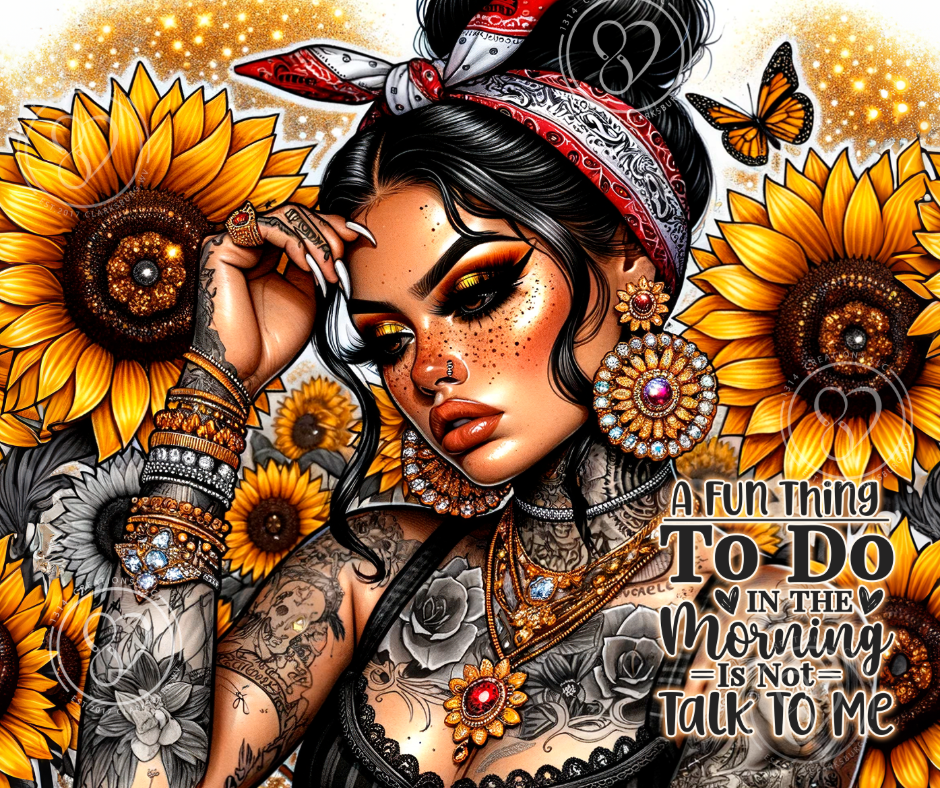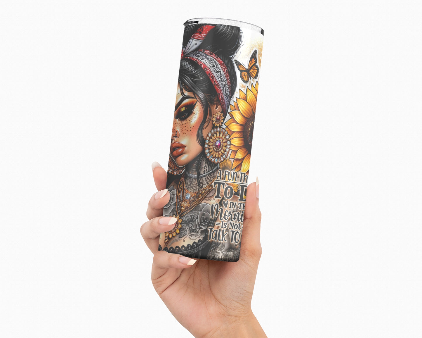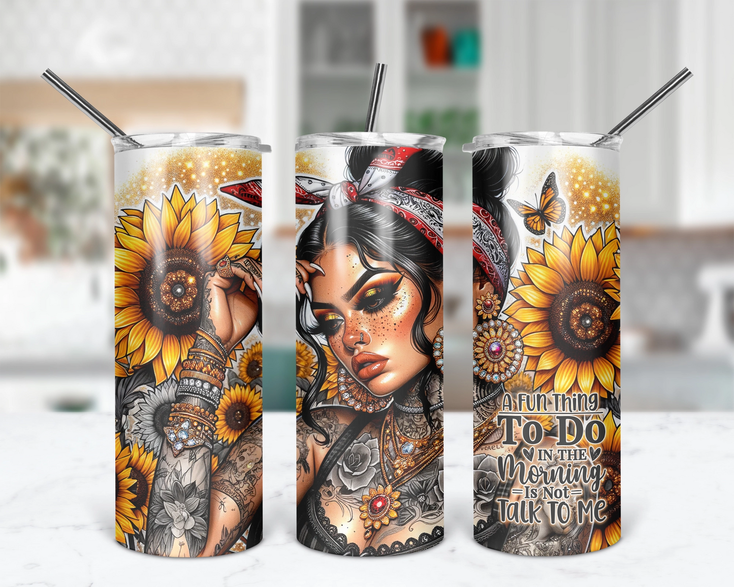 Kickstart your day with our sassy 'A Fun Thing To Do In The Morning' tumbler! Featuring a fierce tattooed girl amidst a backdrop of butterflies and sunflowers, and the blunt statement: 'A fun thing to do in the morning is not talk to me.' Because who needs small talk when you've got attitude to spare? Perfect for those who prefer their mornings drama-free!🌻🦋 #NotAMorningPerson #SassyMornings #LeaveMeAlone #SipAndShine