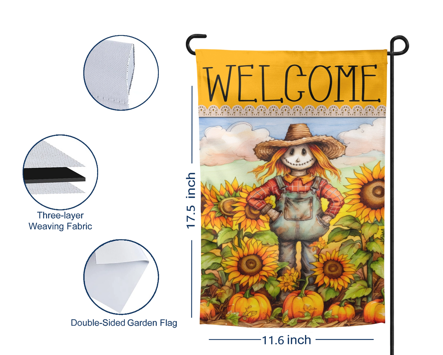 Embrace the arrival of autumn with the charming Cozy Cornucopia Garden Flag! Featuring an adorable scarecrow surrounded by sunflowers and pumpkins, this flag adds a delightful touch of fall to your outdoor space. Infuse your garden with warmth and vibrant colors! π»ππ