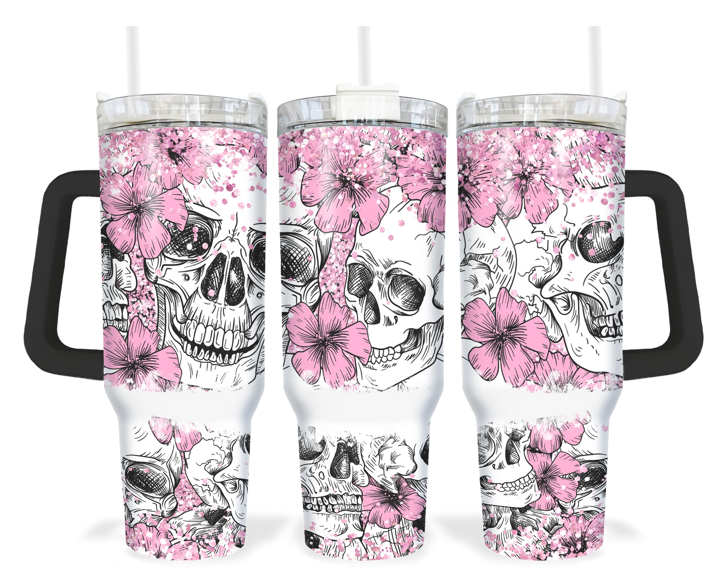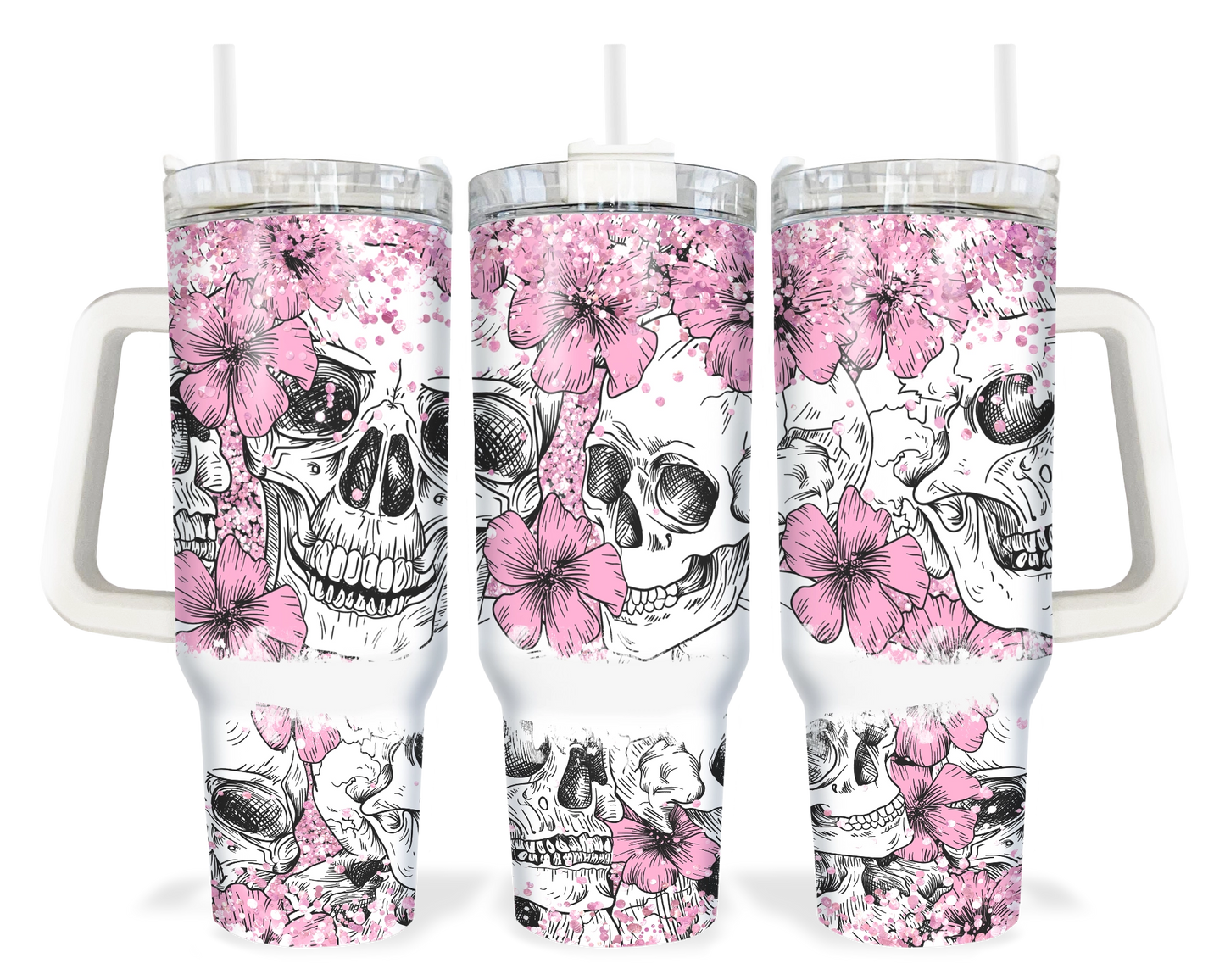 Introducing our Flowering Phantoms Tumbler – where beauty meets a touch of mystery in every sip! This 40oz tumbler isn't your ordinary cup; it's a captivating blend of elegance and edginess. Featuring a striking pink floral design intertwined with hauntingly beautiful skulls, this tumbler is a masterpiece of contrasts.