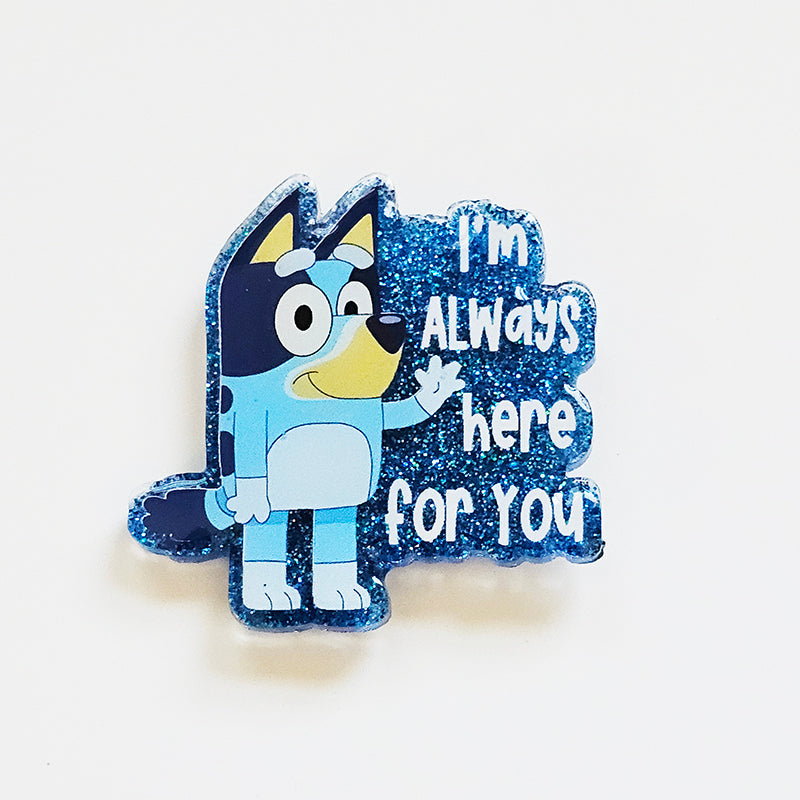 Add a paw-sitive touch to your work accessories with the "I'm Always Here For You" Vent Clip Interchangeable Badge Reel Topper! Designed with adorable blue dog art and the heartwarming phrase "I'm Always Here For You", this topper brings a smile to your face while spreading love and support. Made from durable, high-quality materials, it’s built to last while also offering a fun, charming design to refresh your work style. The convenient velcro attachment makes swapping your badge reel topper as easy as 1-2-3. Perfect for anyone looking to add a personalized touch to their badge reels, this topper is especially ideal for dog lovers, healthcare professionals, and anyone with a positive attitude. Whether you’re brightening your day or someone else’s, this topper is sure to keep you smiling!