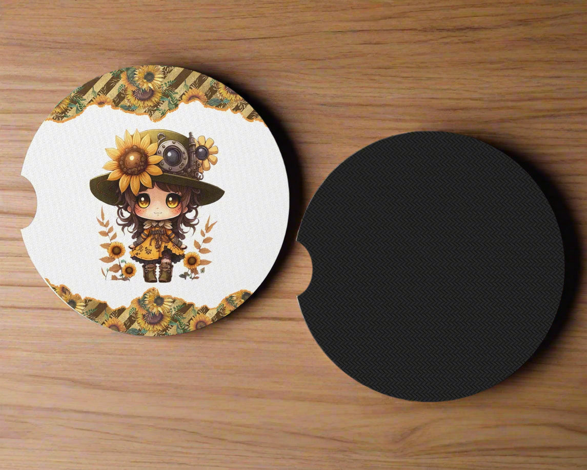 Little Miss Sunshine Car Cup Holder Coasters - Set of 2 Sunflower Coasters - Steampunk Car Decor