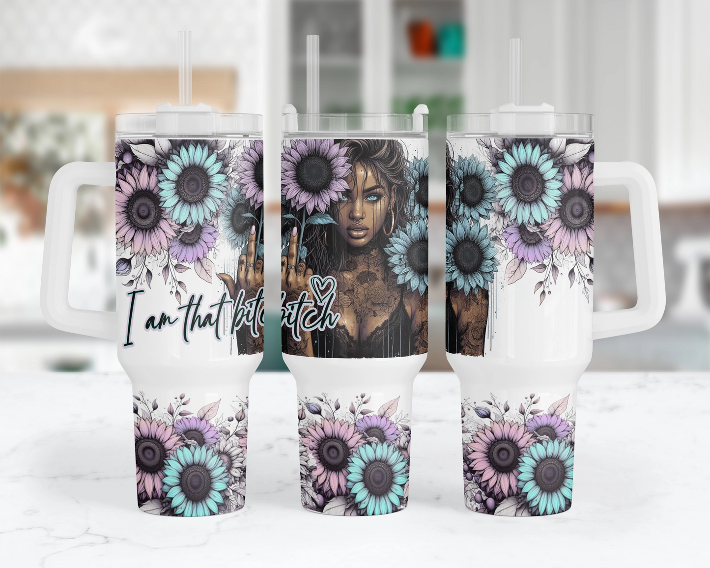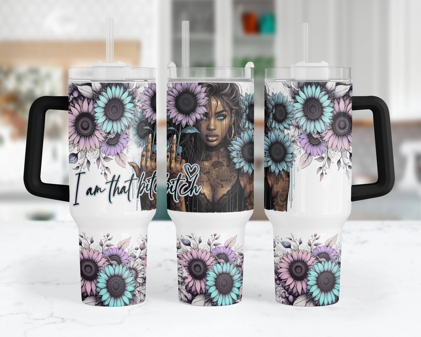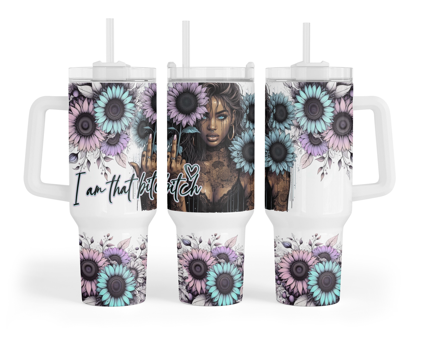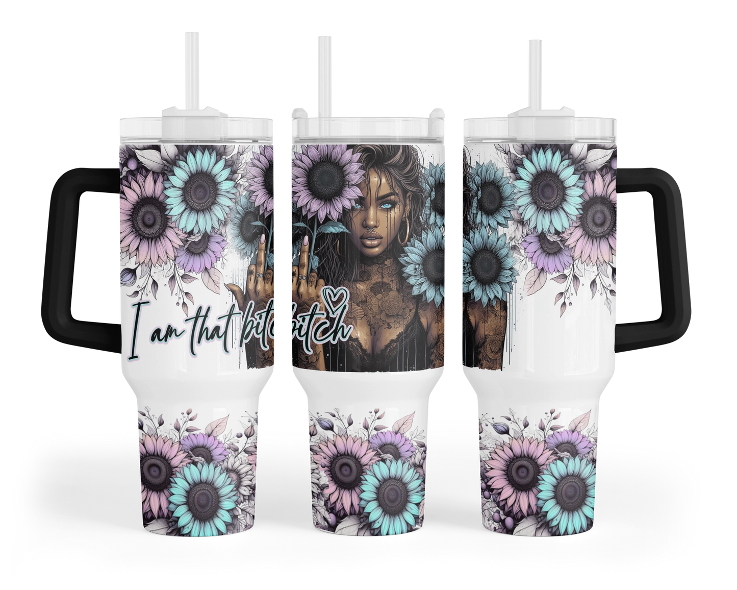 Introducing our "Mandala Muse" 40oz Tumbler – because who says empowerment can't come with a side of sass? Featuring a fierce blue-eyed girl rocking mandala tattoos and proudly flipping the bird with the words "I am that bitch," it's a bold statement for those who take no BS. Sip with attitude and let your inner badass shine! ✨🖕 💁♀️🌻 #SassySips #MandalaMoxie #UnapologeticAF