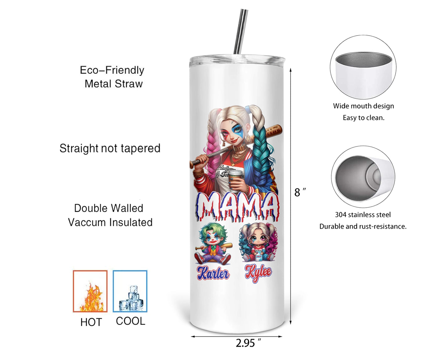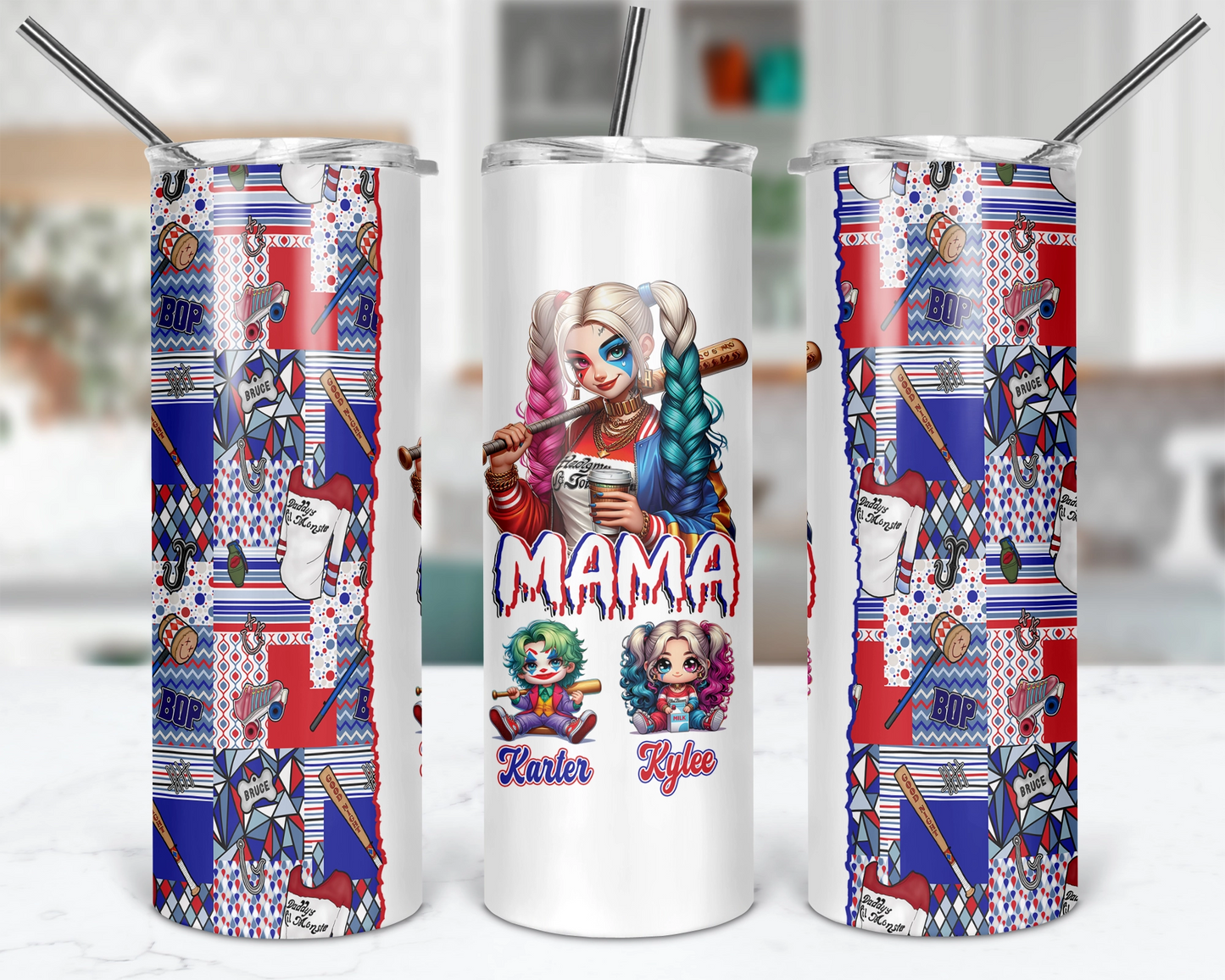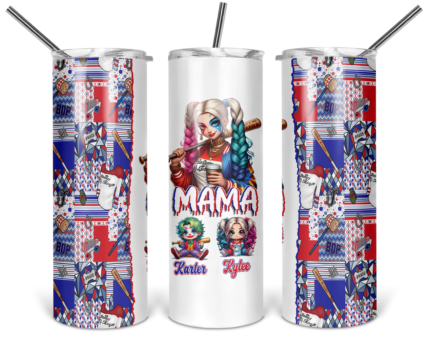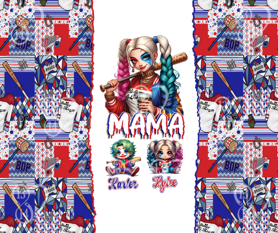 Rev up Mom's day with our Harley Quinn themed inspired tumbler, featuring 'Mama'! Customize the characters with her kids' names for a personalized touch she'll love. Whether she's on the go or relaxing at home, this tumbler adds a touch of superhero style to her day. 🦸‍♀️💥#MomGift  #PersonalizedTumbler #SuperheroMom