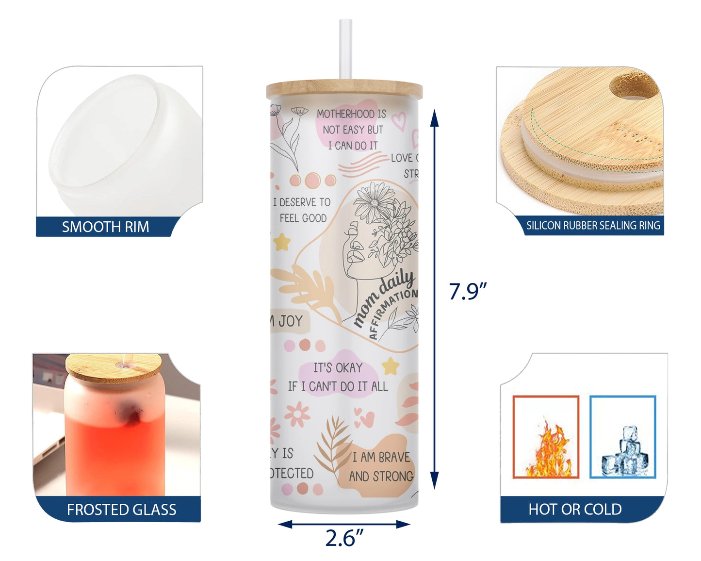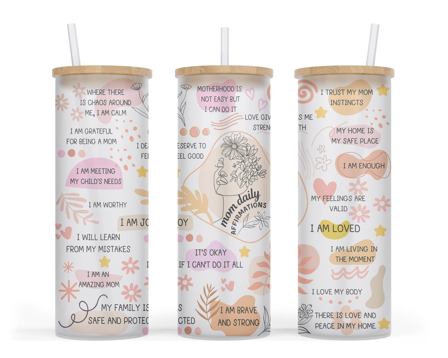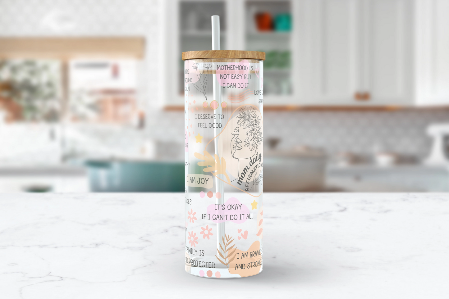 Take your daily positivity with you with the Positive Daily Mom Affirmations Glass Tumbler Cup! Featuring inspirational mom affirmations, this stylish glass cup is the perfect way to stay motivated, inspired, and positive during your daily activities. Let your cup be a daily reminder that you can make it through the day – and that you deserve a moment to take a break and enjoy a hot beverage.