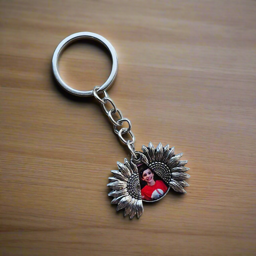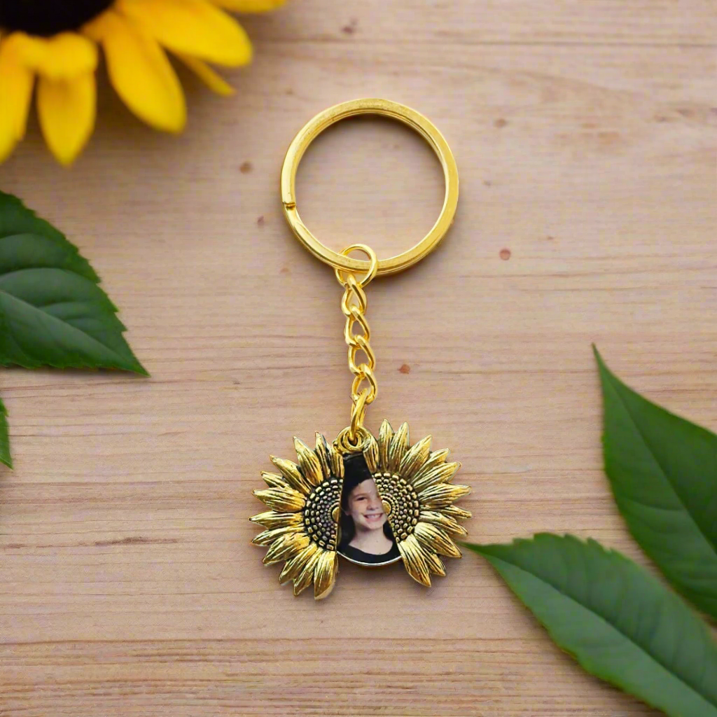 #SunflowerKeychain #SentimentalAccessories #PersonalizedKeepsake #JoyfulGift #CharmingKeychain #PhotoKeychain #SunshineVibes #MeaningfulGifts #RadiantDesign #SunflowerLovers