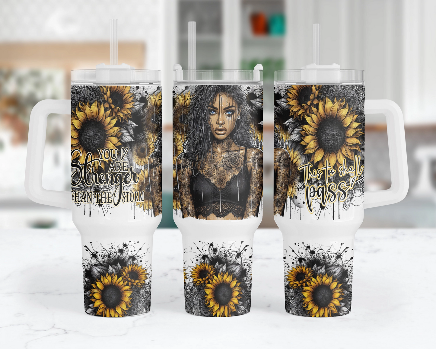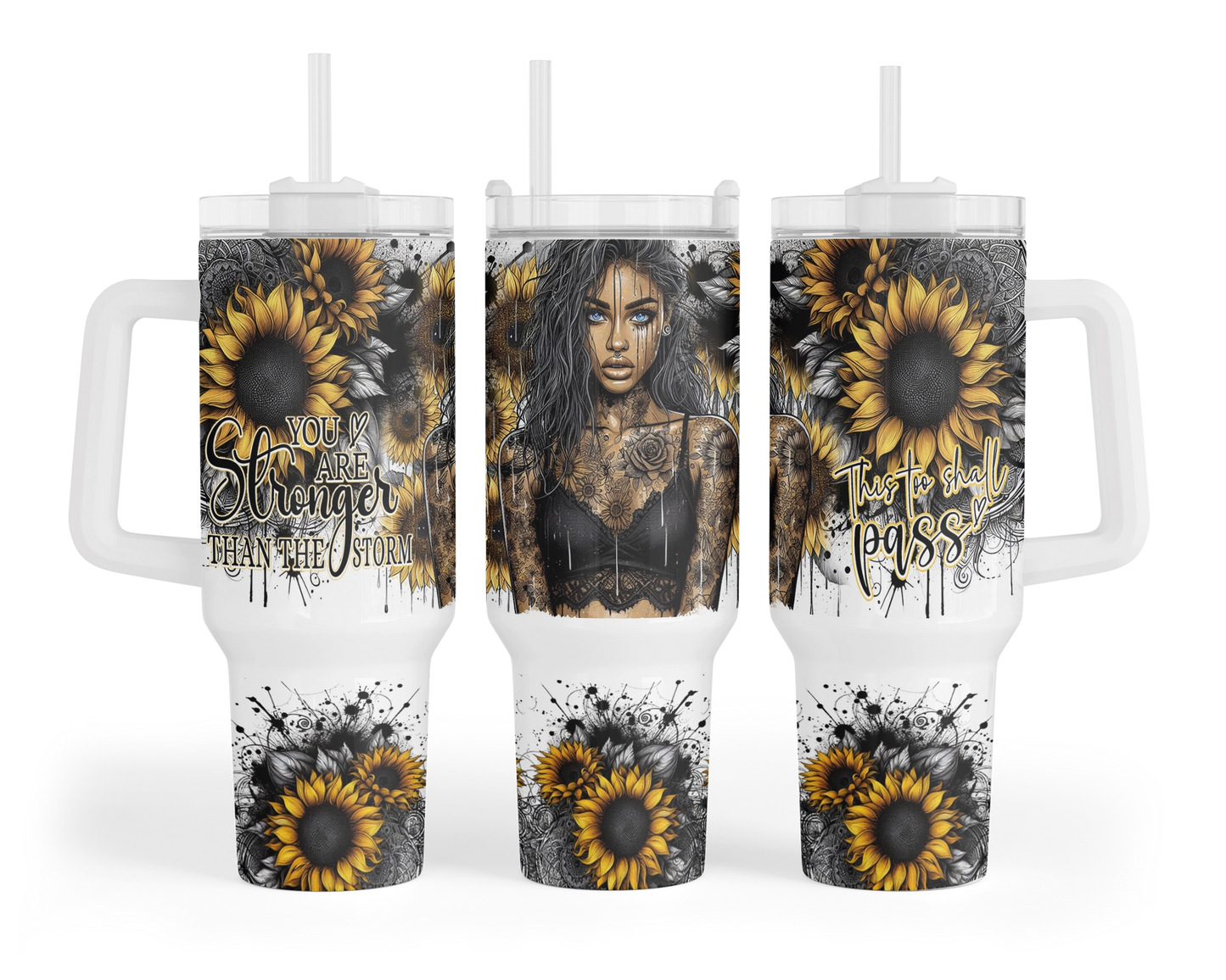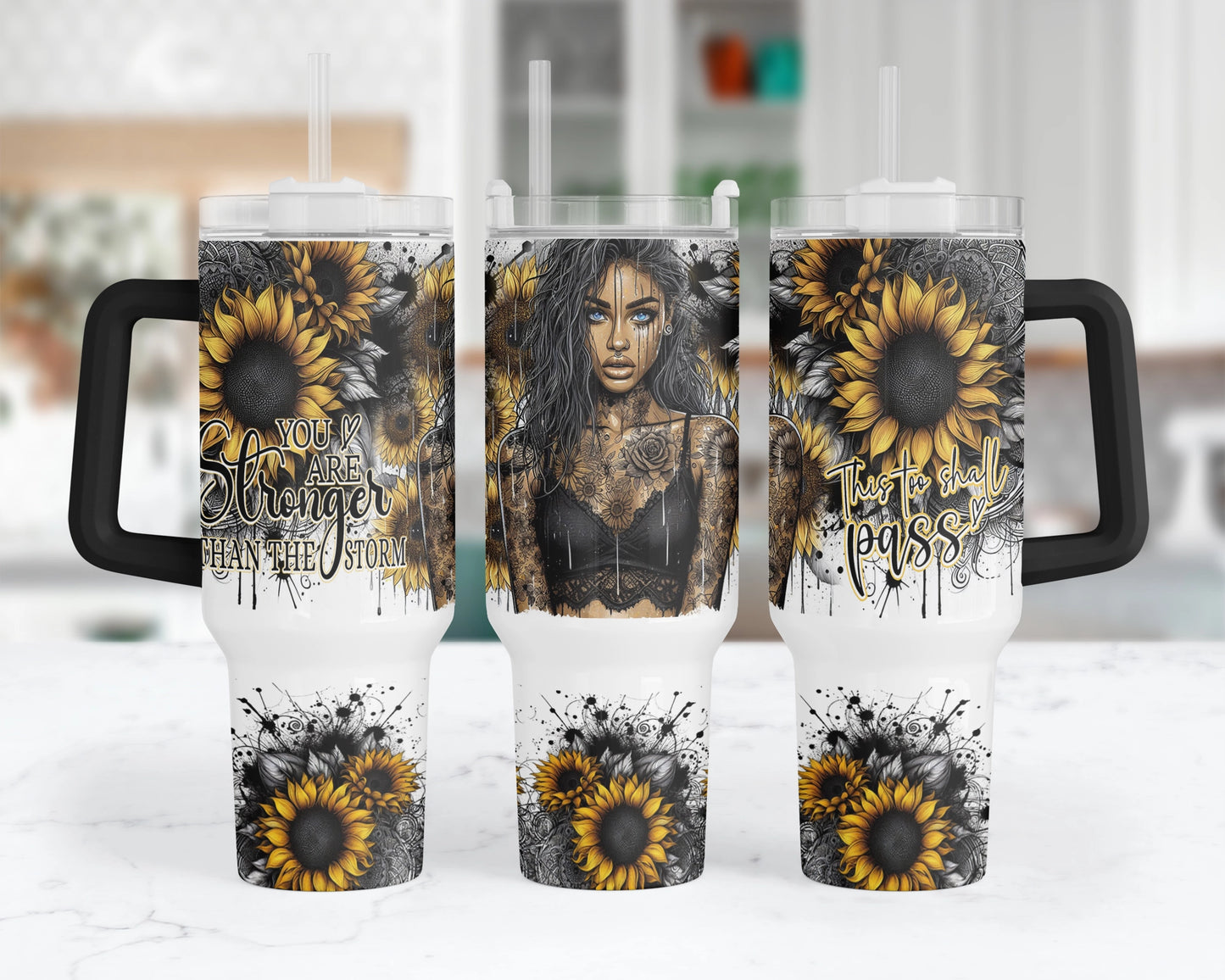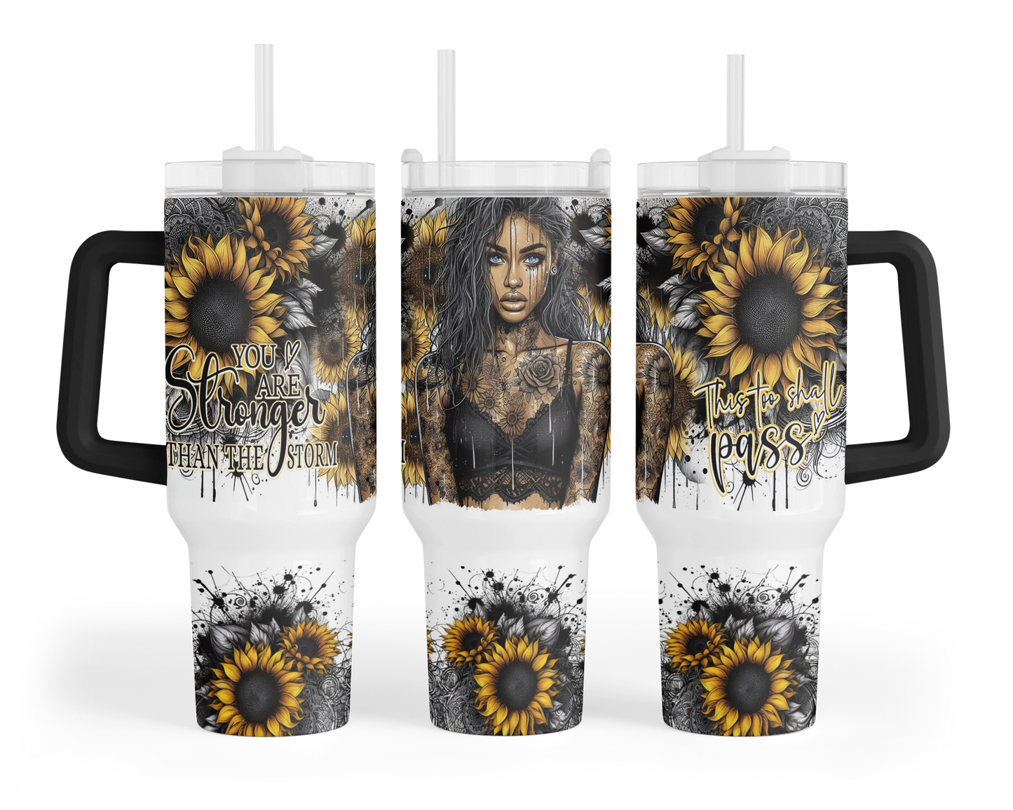 Get your daily dose of sass and inspiration with our This Too Shall Pass Tumbler! Featuring a fierce tattooed girl amidst black mandalas and vibrant sunflowers, this tumbler reminds you that you're stronger than any storm. Because why settle for basic positivity when you can have edgy motivation? Perfect for powering through life's challenges with style.💪🌻🥤 #ThisTooShallPass #SassyInspiration #TattooedMotivation #StayStrong #SipAndConquer