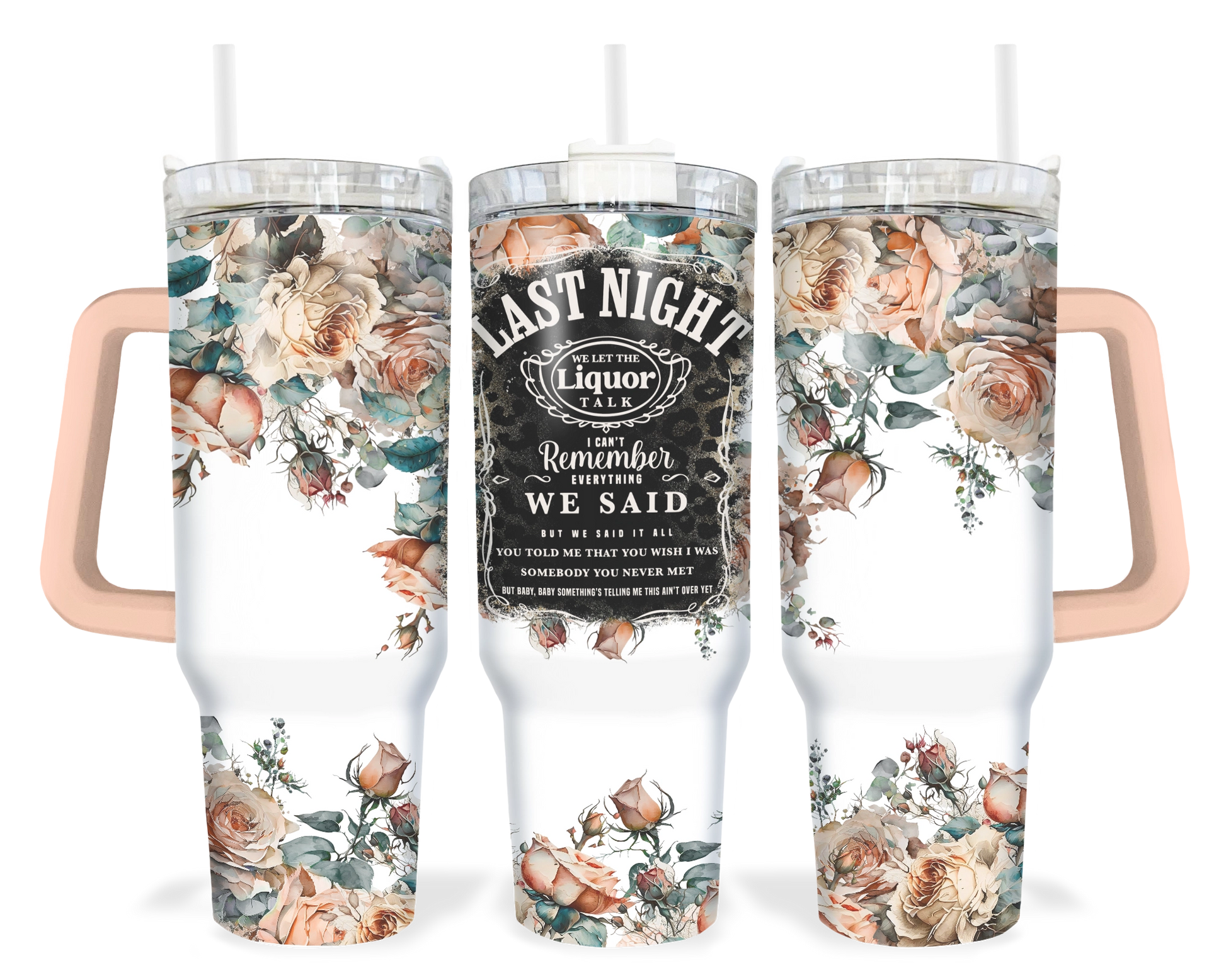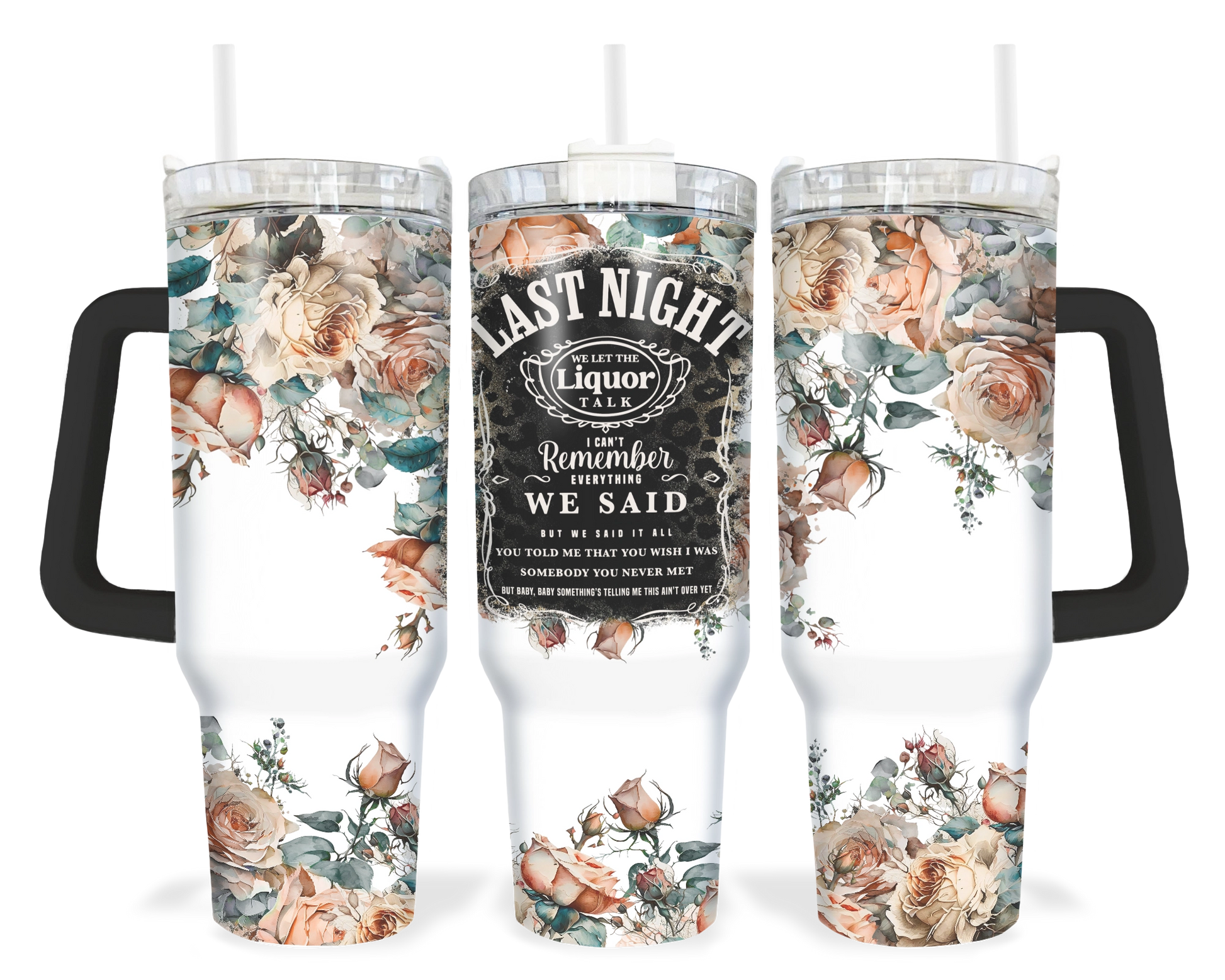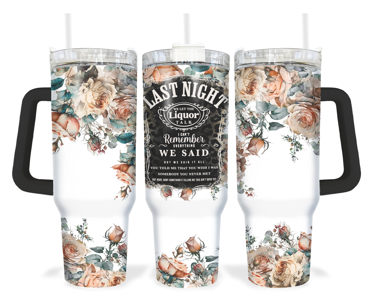 Raise your glass to honesty with our 'We Let The Liquor Talk' Tumbler! Let this 40oz tumbler adorned with a stunning floral design and a whiskey label remind you of those nights when the liquor did all the talking. With the lyrics 'Last night we let the liquor talk...' boldly displayed, who needs a therapist when you've got booze-fueled heart-to-hearts? Cheers to unforgettable nights and questionable decisions! Get yours now and let the memories flow like the drinks did. 🎶✨ #LiquorTalkTumbler #LiquidConfessions